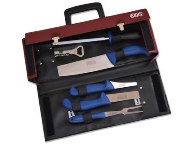 2690 souprava kuchařská 6díl. hmotnost: 1180 g sada obsahuje: 1655 nůž řeznický vykosťovací 5 1670 nůž řeznický 7 ..idlice kuchyňská 3227 ocílka 3445 otvírač číšnický Sada obsahuje 3 řeznické nože, kuchyńksou vidlici, ocílku a ovírák.