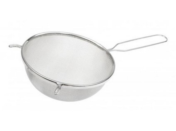 rozměry: 26 / 24 cm Kovové tkanivo pevně spojené s obrubou z ocelového plechu a držadlem s háčky z ocelového drátu. Galvani..dník hrubý řidší tkanivo s oky 1 x 1 mm. Výrobený pro snadné cezení všech pokrmů. Je opatřen praktickým háčkem pro zavěšení.