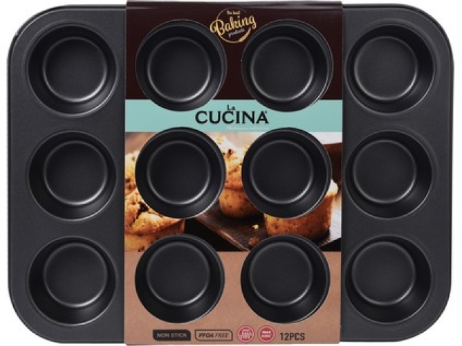 - rozměry: 35 x 26,5 x 3,5 cm - nepřilnavý povrch - forma na 12 ks Forma na 12 muffinů je opatřena vysoce odolným antiadhézním povlakem, který zabraňuje připalování. Vhodné do elektrické, plynové i horkovzdušné trouby, vhodné do myčky.