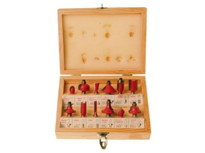 Tvarové frézy na dřevo - sada 12 ks stopka 8mm balení : dřevěný box Frézy jsou osazeny kvalitními SK plátky, vyrobe..žiskem. Jsou ideální pro frézování drážek a hran různých tvarů. Slouží pro přesné obrábění dřeva v truhlářských dílnách.