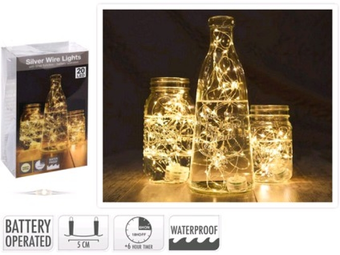 Dekorační osvětlení 20LED, 1,3 m, s časovačem, voděodolné. LED dekorace světla - střbrný drát teplá bílá časovač baterie: 2..plým bílým světlem pro univerzální pouužití. Řetěz je voděodolný, takže lze využít i k zajímavým efektům v nádobách s vodou.