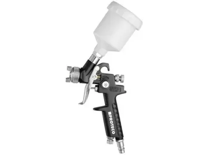 Stříkací pistole s horní nádobkou 110 ml je určena pro stříkání středních a velkých ploch. Je vhodná zejména pro autoopraváře, lakýrníky, nábytkáře, kutily, aranžéry apod. Je možné stříkat různé druhy barev, laky a lazury a to i vodou ředitelné. Pistole má systém HVLP (High Volume Low Pressure). U tohoto systému se k rozprášení barvy používá velké množství vzduchu o nízkém tlaku. Tato metoda se vyznačuje vysokou efektivitou a nízkými ztrátami. Pistole se při správném naředění barvy vyznačuje velmi dobrou kvalitou nástřiku. Kužel rozprášené barvy je homogenní a netvoří "hluchá" místa. Tělo pistole je hliníkové. Barvová tryska i jehla jsou z důvodu vysoké životnosti vyrobeny z nerezové oceli. Čelní vduchová tryska s převlečnou maticí je vyrobena z mosazi. Tuto trysku lze otáčet. Je možné tak podle potřeby nastavit horizontální nebo vertikální rozptyl. Po uzavření bočního regulačního ventilu bude mít pistole rozptyl pouze kruhový. Zadním regulačním šroubem lze nastavit chod jehly a regulovat tak množství barvy. Výhody a chrakteristické znaky - Nádobka 110 ml tryska 0,8 mm - Systém HVLP - Tělo pistole vyrobeno z hliníku - Barvová tryska a jehla vyrobeny z nerezové oceli - Pozn.: závit trysky je z výroby utěsněn tmelem. Při prvním povolování trysky je nutné trysku lehce ohřát (na max. 150°C) horkovzdušnou pistolí, aby došlo ke změknutí tmelu, a tím k lehčímu povolení trysky. Při zpětné montáži je nutné závit trysky opět zatěsnit nejlépe tekutým tmelem na závity.