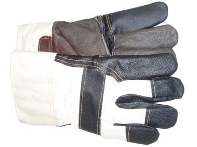 Rukavice FIREFINCH zimní zesílené. Zimní kombinované rukavice, dlaň z různobarevné lícové nábytkové hověziny, hřbet a manžeta z bílé bavlněné tkaniny, zateplená podšívka.