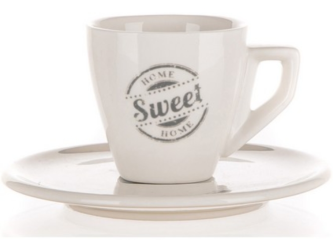 Šálek s podšálkem SWEET HOME 60 mlŠálek s podšálkem SWEET HOME 60 ml square vyrovený z porcelánu s bílou glazurou a dekorem ..o (kg): 0,21 | Hmotnost brutto (kg): 0,22 | Materiál: Porcelán | Dekor: Sweet Home | Barva: Bílá | Výrobce / značka: BANQUET