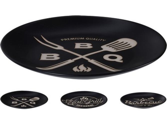 Talíř mělký 27 cm, keramický, ČER matný, mix dekorů. průměr: 27 cm ..BISTRO, BBQ mix mix 3 druhy Designoový talíř s motivy BBQ, který se bude skvěle vyjímat na Vašem stole nejen při grilování.